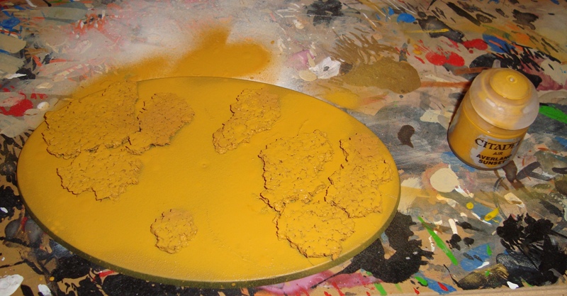 Na początek podstawka została obklejona korkiem i pomalowana w widoczny wzór przy pomocy aerografu oraz farb: Averland Sunset, Flash Gitz Yellow, Troll Slayer Orange i White Scar. Po wyschnięciu farb zabezpieczyłem całość lakierem matowym - olejnym. Dlaczego ? Podczas robienia testów farba Martian Ironearth podczas pękania miała miejscami tendencję do odchodzenia razem z kolorem bazowym odsłaniając podstawkę. Polakierowanie całości przed nałożeniem pękającej farby spowodowało to, że nic z bazowych kolorów nie pękło razem z farbą techniczną.
