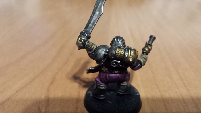 Nieźle, kolory dobre, nadlewek czy linii podziału formy jakoś nie widzę, jedna uwaga, namaluj czarną kropeczkę w środku lufy pistoletu, żeby wydawała się pusta. Możesz też skalpelkiem nawiercić i wtedy zamalować.