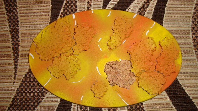 Na początek podstawka została obklejona korkiem i pomalowana w widoczny wzór przy pomocy aerografu oraz farb: Averland Sunset, Flash Gitz Yellow, Troll Slayer Orange i White Scar. Po wyschnięciu farb zabezpieczyłem całość lakierem matowym - olejnym. Dlaczego ? Podczas robienia testów farba Martian Ironearth podczas pękania miała miejscami tendencję do odchodzenia razem z kolorem bazowym odsłaniając podstawkę. Polakierowanie całości przed nałożeniem pękającej farby spowodowało to, że nic z bazowych kolorów nie pękło razem z farbą techniczną.