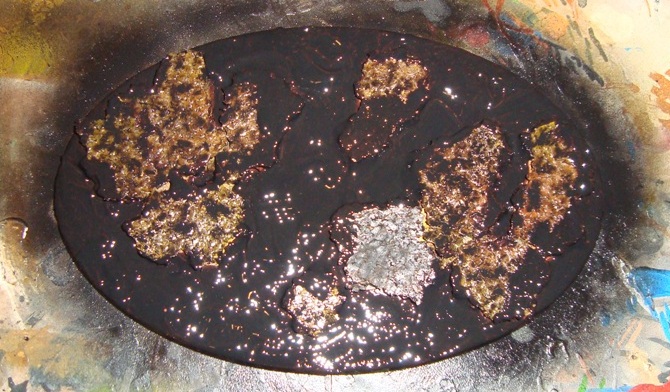 Kolejnym krokiem było nałożenie grubej warstwy farby Martian Ironearth. Zaraz po nałożeniu tej farby (nie czekałem na jej wyschnięcie - czas ma tu znaczenie ponieważ farba pęka a zależało mi na efekcie lawy płynącej pod spękaną, czarną ziemią) całość pomalowałem przy pomocy aerografu farbą Abbadon Black.