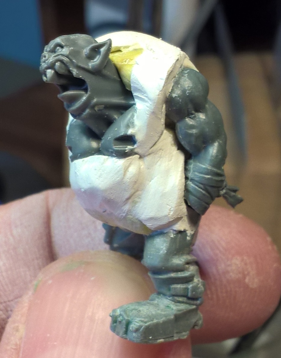 Nie widać tego, bo nie pomyślałem o zrobieniu zdjęcia ale do nóżek doczepiłem szkielet ze spinacza (metodą jak przy pinowaniu do podstawki: dwie dziurki w które wetknąłem spinacz plus superglue). Wykorzystałem też głowę z zestawu Ironjaws Brutes. Była razem z torsem ale tors zakryłem, bo był zbyt szczupły w stosunku do mojej koncepcji tłustego treneiro.